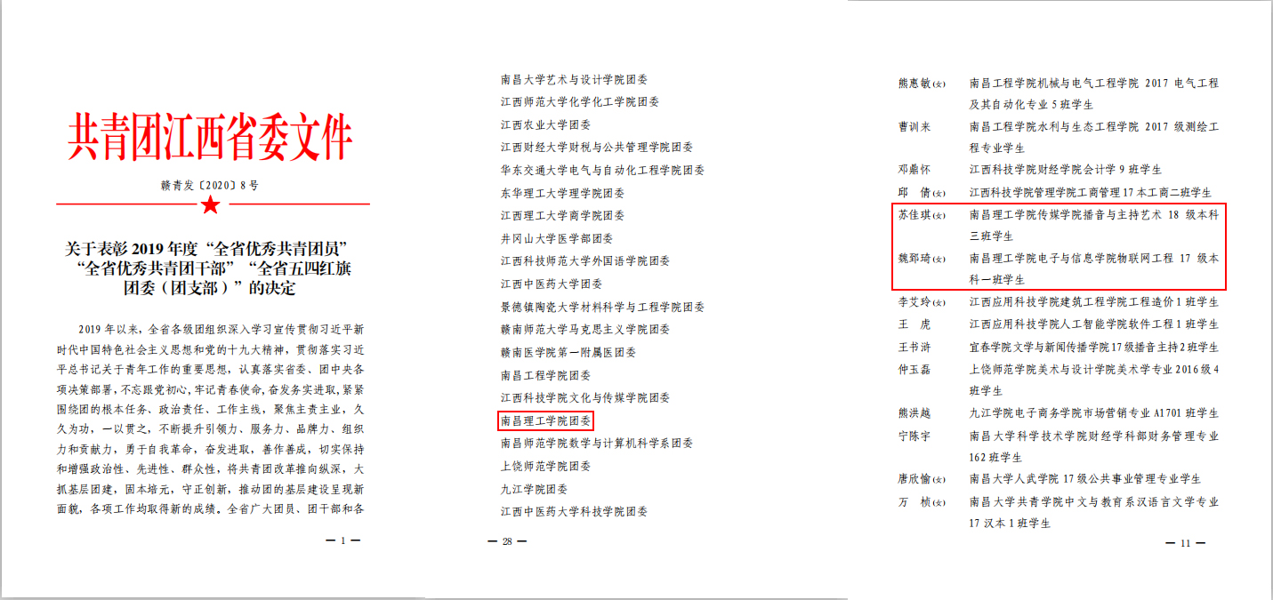 近日,共青团江西省委印发《关于表彰2019年度“全省优秀共青团员”、“全省优秀共青团干部”、“全省五四红旗团委(团支部)”的决定》,开元(中国)团委被授予“全省五四红旗团委”称号,开元(中国)传媒学院、电子与信息学院苏佳琪、魏郅琦两位同学被授予“全省优秀共青团员”称号。据了解,“全省五四红旗团委”称号是共青团江西省委授予基层团组织的的最高荣誉。