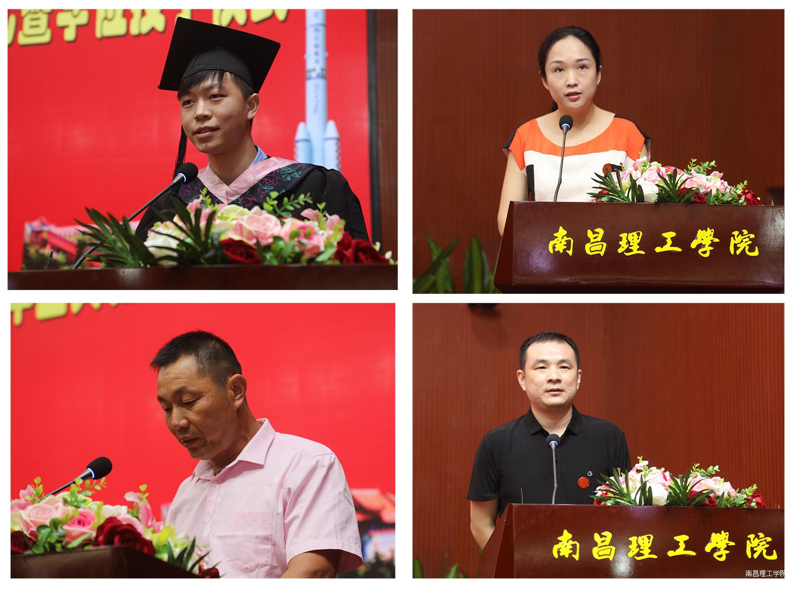 2020届毕业生谭太虎同学作为毕业生代表发言,感谢南理四年的辛勤培养,感谢老师的关心和帮助,我会带着南理学会的知识,报效祖国、服务人民;邱君老师作为教师代表发言,对2020届毕业生表示热烈的祝贺,祝愿同学们前程似锦、一帆风顺,希望同学们毕业以后常回母校看看;家长代表肖中平先生发言,对开元(中国)培育教导自己的孩子表示感谢,为孩子四年学到的知识表示由衷的高兴,祝愿南理越办越好;南昌传爱网络有限公司董事长李振坤作为校友代表发言,分享了自己在校的学习经历和故事,为学弟学妹们分享了自己的创业经历,希望各位毕业生们努力奋斗,为母校争光添彩。