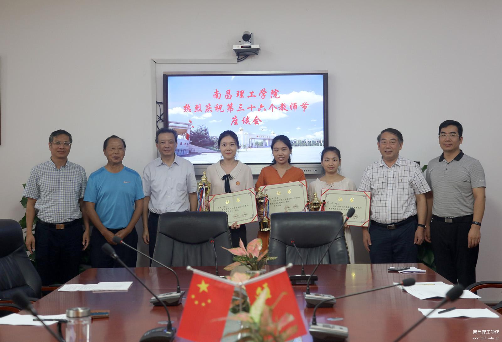 (许基南书记向获得第四届江西省高校青年教师教学竞赛的教师颁发了奖杯和奖状)