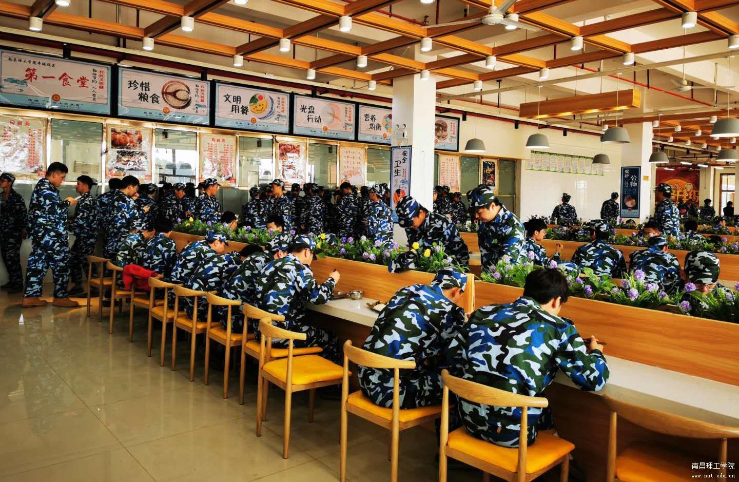 (军训新生在丰城校区环境优美的食堂就餐)