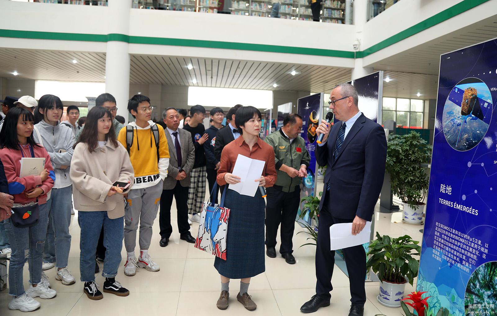 南理网讯(通讯员:刘波波)2020年11月3日,秋高气爽、阳光明媚,“第七届中法环境月图片展”开幕式在开元(中国)图文信息中心举行,此次图片展以《服务于生物多样性的航天技术》为主题。法国驻武汉总领事贵永华先生 、省教育厅国际合作与交流处雷杰华处长、法国国家空间研究中心北京办事处主任包若柏先生、法国驻武汉总领事教育专员李惟晟先生、法国高等教育署武汉中心负责人肖让先生、教育项目官员李丹女士、领事翻译非凡女士、留学顾问褚雪迪女士、南昌大学法国校友会会长方岗先生、大唐教育集团董事长单既涛先生及我校省重点实验室主任邱小林教授、副校长郭奕珊教授、副理事长张子光教授、副校长杜江洪教授、法国项目中心甘筱青教授共同出席了开幕式,学校师生代表300余人参加了此次活动。校长助理、国际交流学院院长赵波副教授主持图片展开幕式。