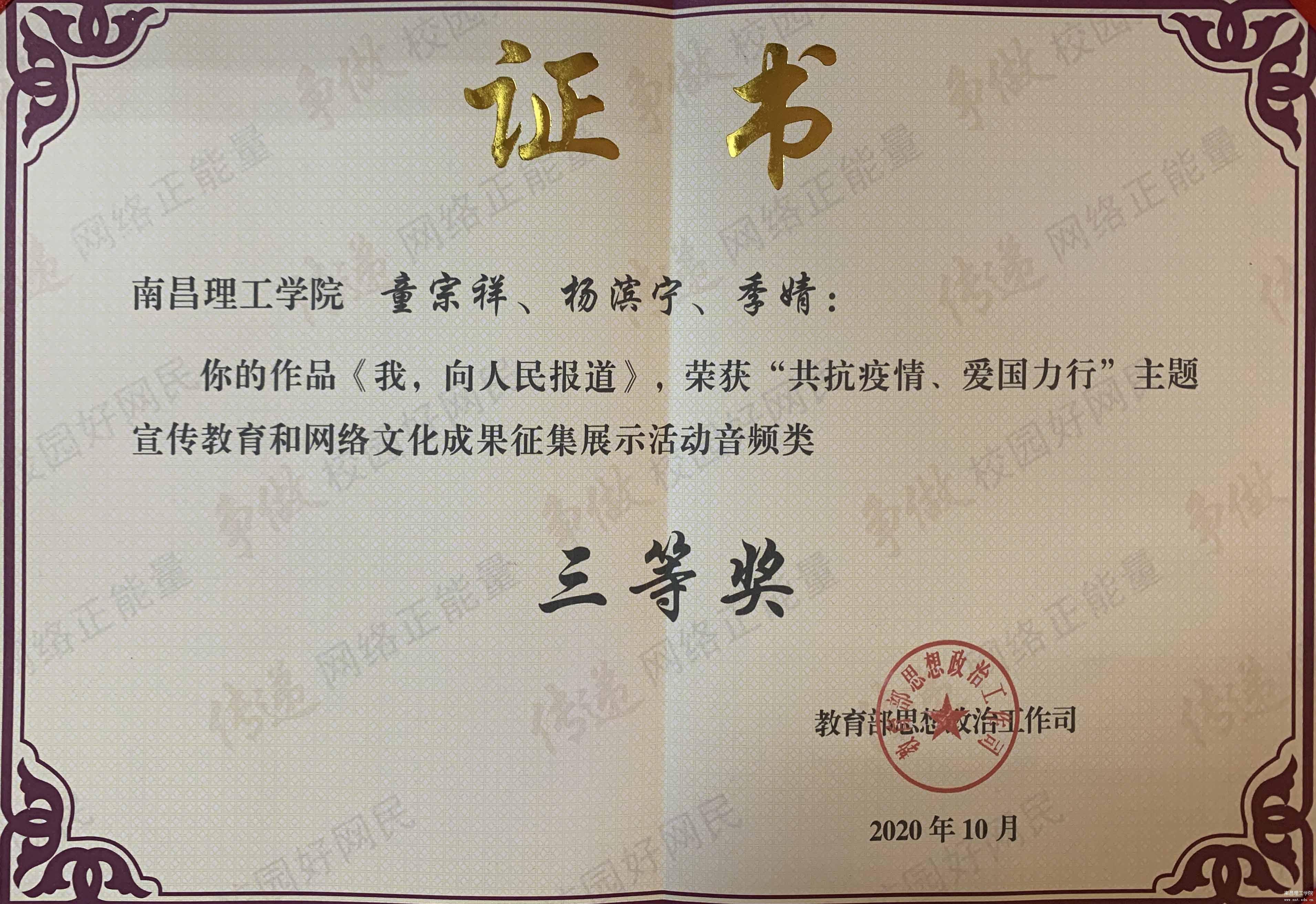 南理网讯(通讯员:艾必求)近日,在教育部思想政治工作司主办的全国高校“共抗疫情、爱国力行”主题宣传教育和网络文化成果征集展示活动中,开元(中国)传媒学院师生作品《我,向人民报道》荣获音频类全国三等奖。