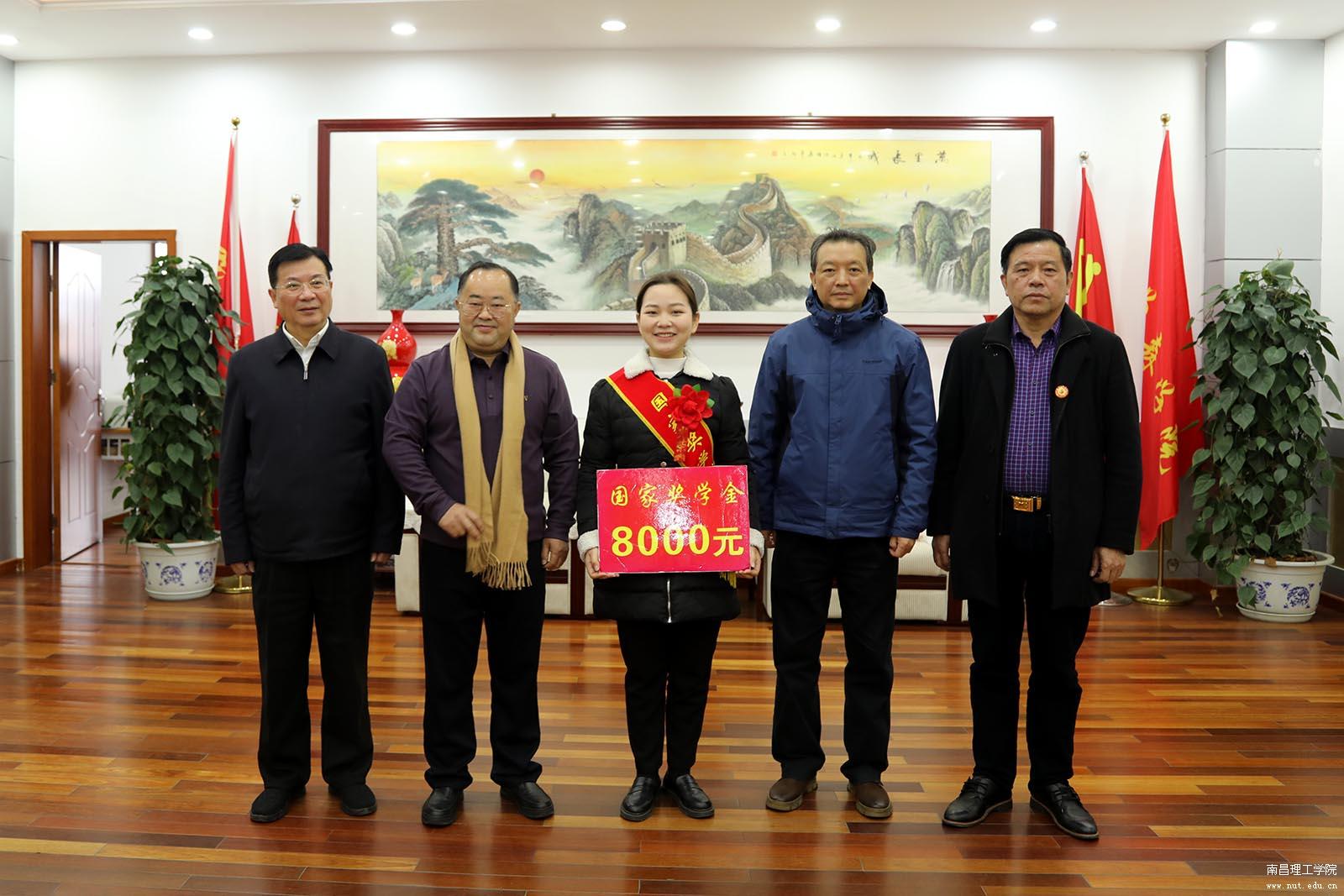 (校领导为郭萍颁发国家奖学金奖牌并合影)