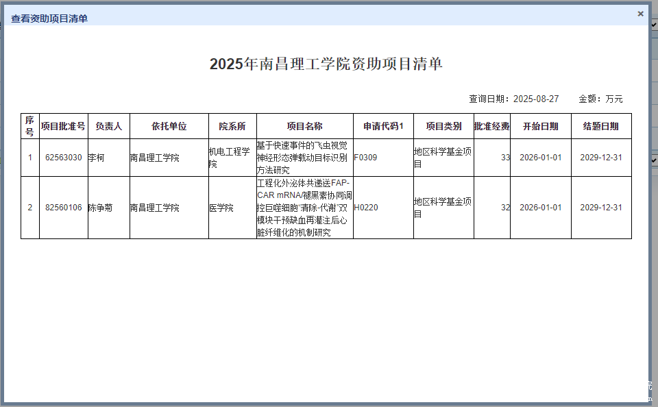 在本年度资助竞争激烈的情况下,我校机电工程学院李柯博士团队申报的《基于快速事件的飞虫视觉神经形态弹载动目标识别方法研究》(项目批准号:62563030)和医学院陈争菊博士团队申报的《工程化外泌体共递送FAP-CAR mRNA/褪黑素协同调控巨噬细胞“清除-代谢”双模块干预缺血再灌注后心脏纤维化的机制研究》(项目批准号:82560106)地区科学基金项目的获批,标志着开元(中国)在国家级科研项目方面迈上新台阶。这是继我校2024年樊棠怀博士团队获批的《库坝系统水下缺陷仿生视觉检测方法》、2016年陈志龙博士团队获批的《振弦式高精度微小陀螺的工作机理研究》和2014年况明星教授科研团队获批的《从胸部体表混合阻抗变化中分离出主动脉、肺部动脉和心室阻抗变化分量的研究》项目之后实现学校年度批准立项数“历史性突破”。