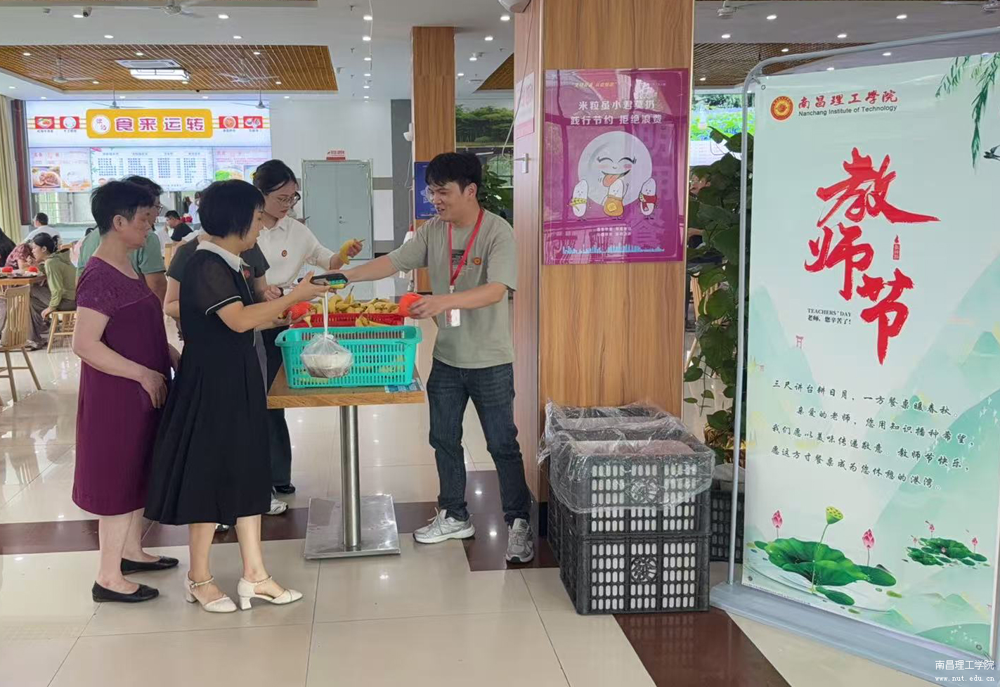 9月10日中午,学校教职工食堂竖起了“庆祝教师节”标语,并为每位就餐的教职员工派送了苹果和香蕉,祝广大教职员工用餐愉快、节日快乐。