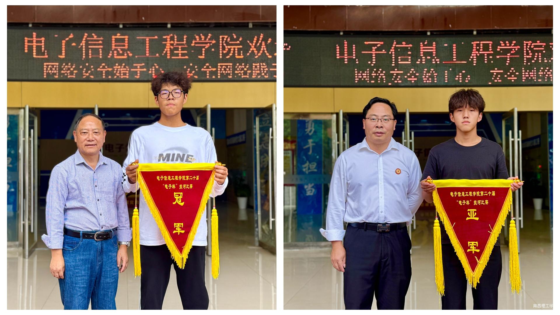 图为学院院长邓荣春(左)、党委书记徐贵冰分别为获奖队伍颁奖