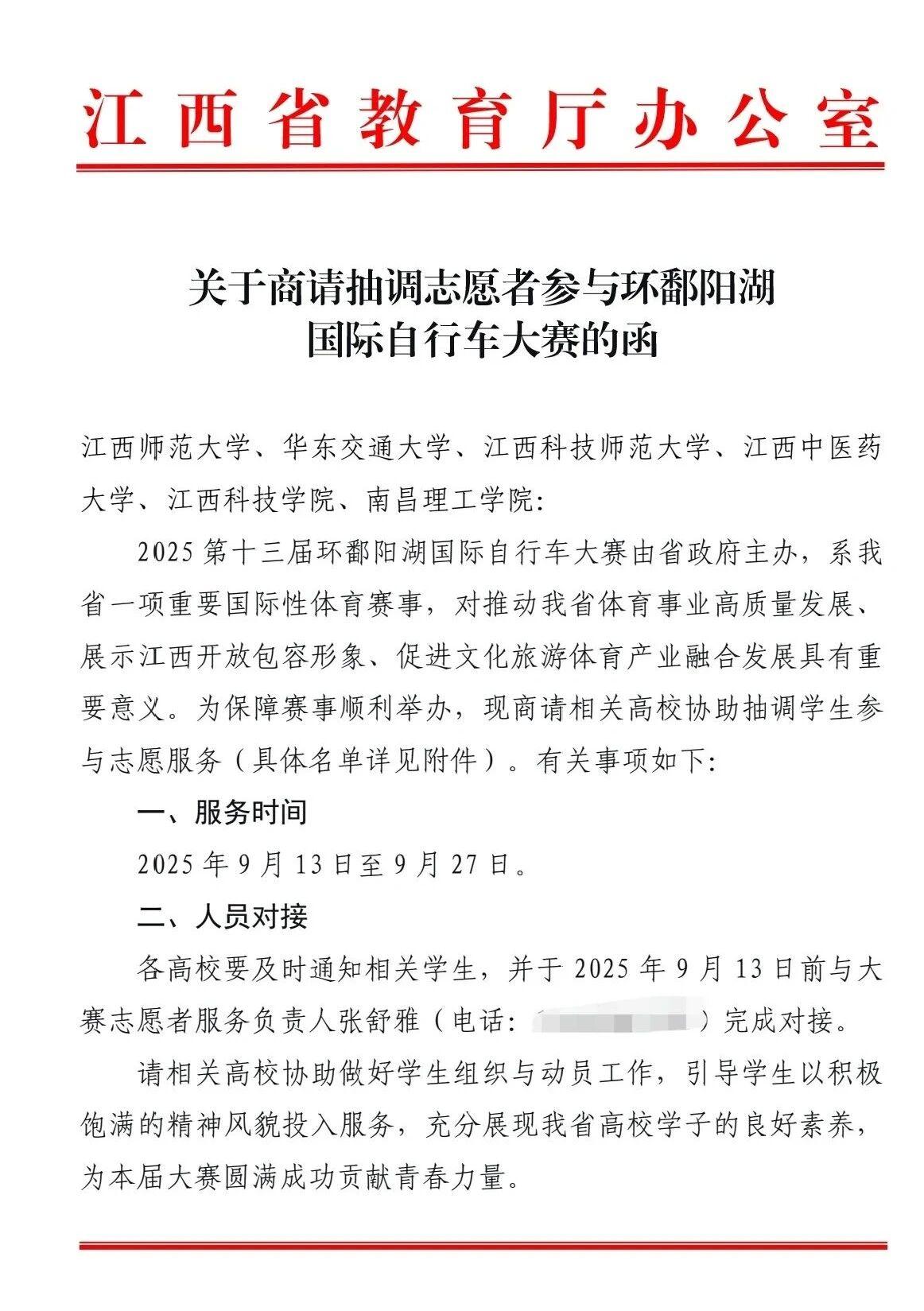 近日,2025“中国建设银行杯”第十三届环鄱阳湖国际自行车大赛成功举办,该赛事由江西省人民政府、中国自行车运动协会主办,江西省体育局、九江市、南昌市、宜春市、萍乡市、新余市、抚州市、吉安市、赣州市人民政府及11个分赛站举办地县级人民政府共同承办。其中,南理学子积极参与本次大会的开幕式、颁奖仪式指引等相关服务工作。