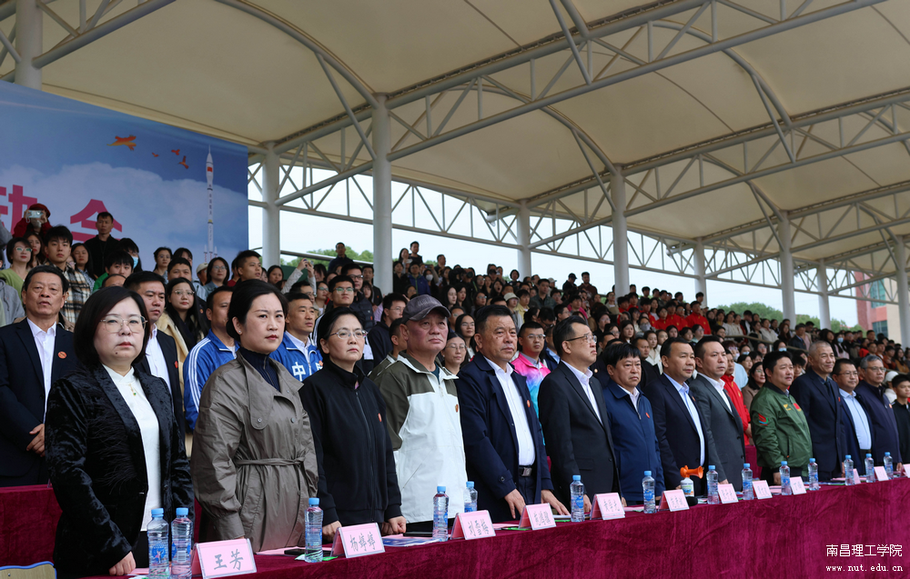 入场式结束后,伴随着雄壮的国歌声,举行了庄严的升国旗仪式,在场全体师生面向国旗高唱国歌。随后举行了升校旗、升运动会旗仪式,伴随着校歌《航天之歌》的歌声,表达着心中对南理的无限热爱。